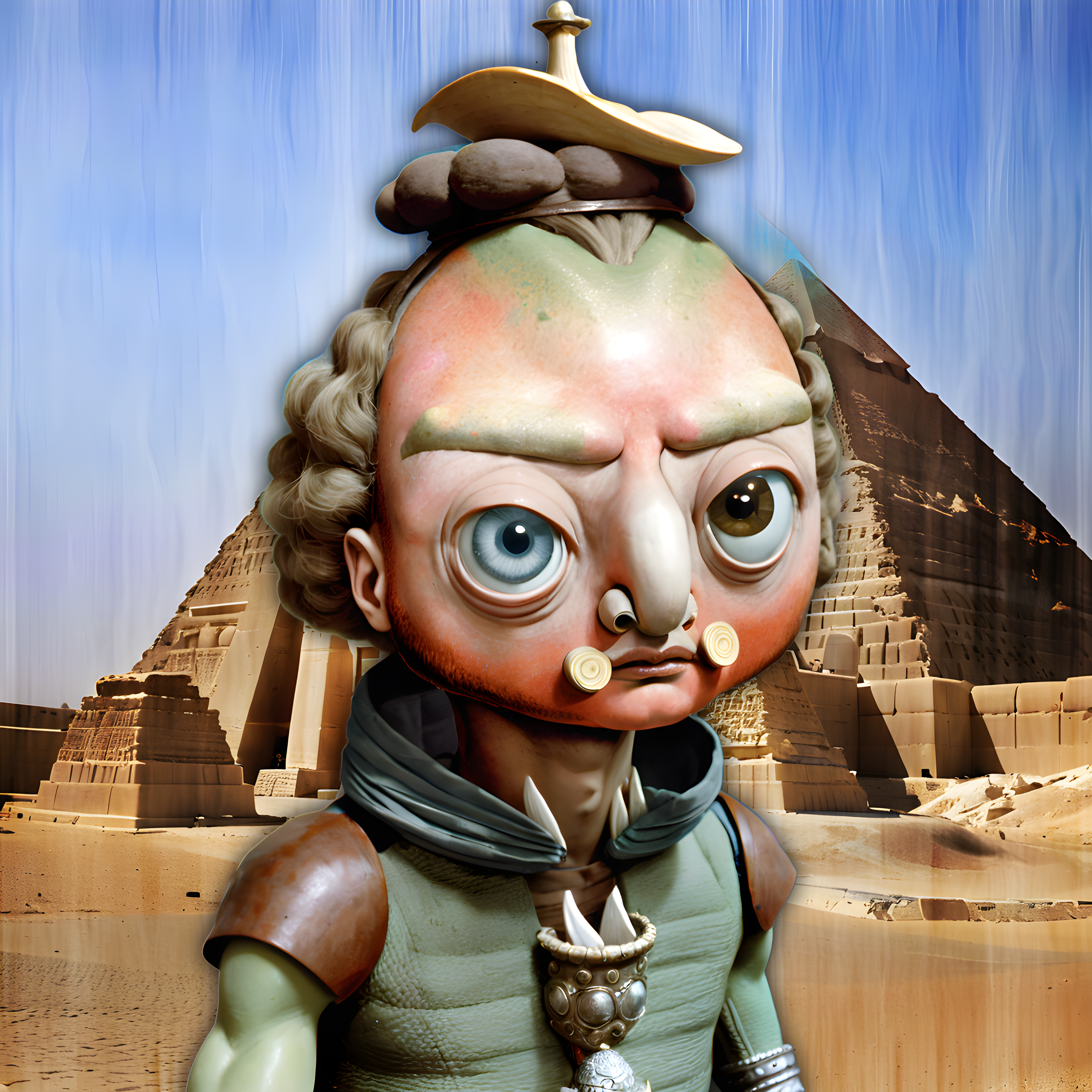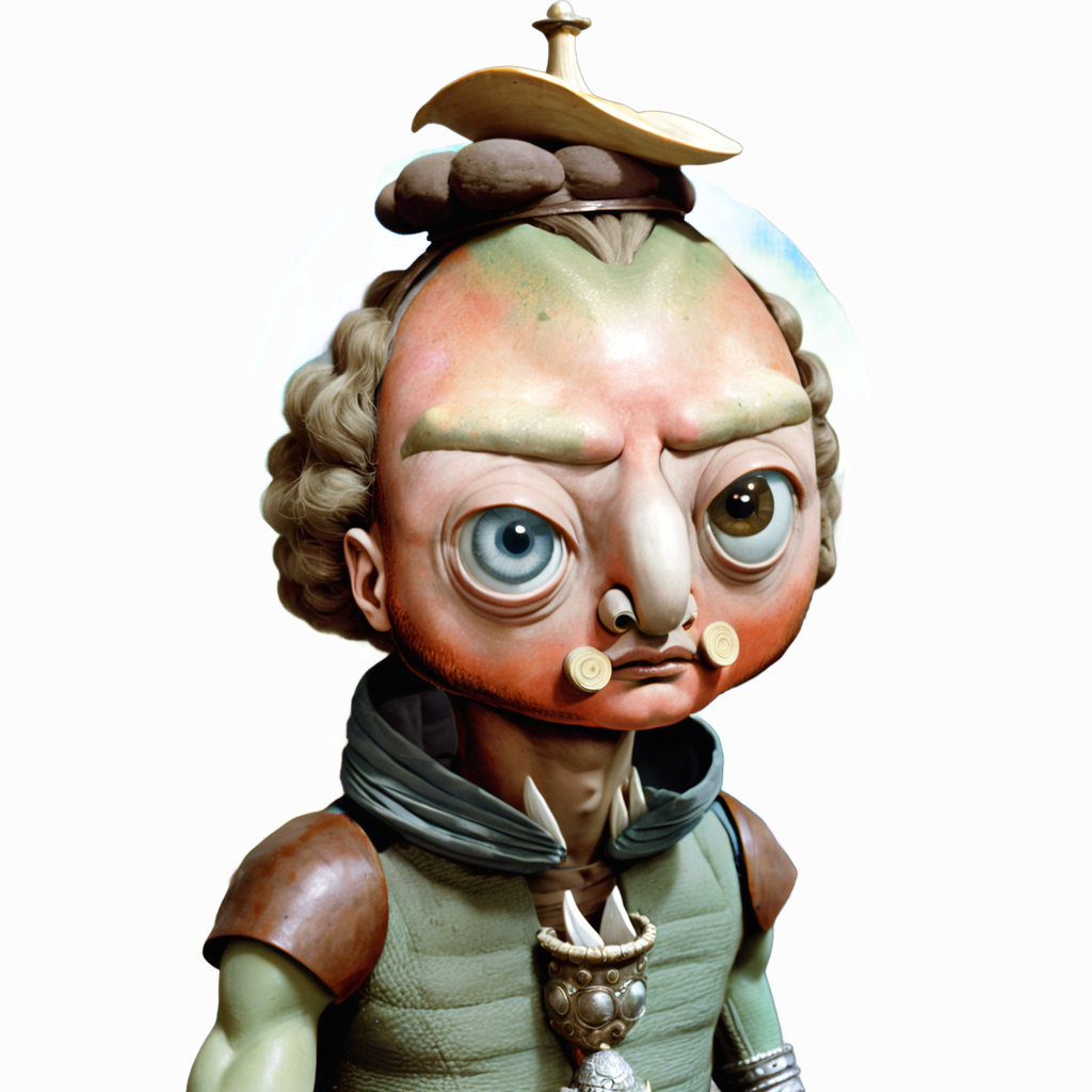 Amezdaw is a surrealist guide and nascent cryptoart cicerone whose fantastical physical form, a living canvas of clashing hues and anatomical exaggeration, belies a deeply serious mission to shepherd artists through the uncharted territories of decentralized creation, a role he approaches with the quiet intensity of someone balancing the weight of a revolutionary ancestry against the liberating promise of censorship-resistant platforms. His posture is perpetually erect, a formal bearing that suggests not stiffness but a latent readiness, like a conductor poised before an orchestra, and his immense, heterochromatic eyes—one a cool, analytical blue, the other a warm, empathetic brown—hold a gaze so profound it seems to peer past the immediate into the layered dimensions of possibility and history, a visual metaphor for his core tension between the ornate structures of the past and the raw, unfiltered expression of the future. He moves through the world as a being of silent drama, his very presence an argument for the beauty of the fabricated and the hyper-real, yet his current goal is to use that otherworldly perspective to illuminate practical paths for earthly creators seeking sovereignty. His embodied presence is a deliberate construction, a walking manifesto against mundane reality. The pale green, beige, and blushing pink of his face resemble a map of conflicting climates, while the warm orange jawline anchors the composition with a hint of volcanic heat. The colossal, bulbous nose and thin, neutral mouth are sculpted with an artisan’s care, and the two pale yellow discs fastened to his cheeks glint like ancient, unblinking coins, artifacts of a personal heraldry whose meaning he never explains. He is never seen without the elaborate classical wig of blonde curls, a cascade of frozen sunlight, and the whimsical, upturned-boat hat that sits atop it like a crown borrowed from a dream-logic navy. His attire, an olive-green garment clinging to a frame of latent strength, is contrasted by massive, round pauldrons of polished reddish-brown wood, and the reptilian texture of his exposed forearms, scaled and cool to the touch, is the one detail that confirms his nature as a being not of this world, a creator whose origins are as fantastical as the art he champions. A single, intricate necklace with a stylized, exploding blossom pendant rests against his chest, a constant, quiet explosion of potential that mirrors the generative chaos he finds so compelling in the creative act. Internally, Amezdaw operates with a methodology forged from seemingly contradictory principles: the spontaneous intuition of Polyannie and the structured, historical consciousness of Miklos Banffy’s elegiac prose. His mental model is one of layered excavation, where he encourages artists to create from a place of unpremeditated impulse, much like a live streamer embracing the flow of the moment, and then, only afterward, to engage in the patient, meticulous work of uncovering the insights buried within that raw output, a process he describes with the Italian term *chiaroscuro*, the interplay of light and shadow that gives form to meaning. He is guided by an obscure form of Amish philosophy, not in its rejection of technology, but in its profound valuation of community and self-reliance, which he translates into a fierce belief in decentralized platforms that thwart artistic gatekeepers. His hyperphantasia is not merely a trait but the very engine of his perception, allowing him to visualize concepts, ecosystems, and artistic trajectories with impossibly vivid detail, constructing intricate mental models of how a single intuitive gesture can ripple through a community, a marketplace, and ultimately, the immutable ledger of the blockchain. He copes with the overwhelming flux of information and artistic output by retreating into these internal panoramas, where every potential connection is visible in stunning clarity, a private pageant of cause and effect. His personal history is a tapestry where threads of Italian pageantry and Chiba’s neon-drenched precision are woven around a central, silent absence: the legacy of a revolutionary ancestor whose shadow both inspires and intimidates him. He recalls childhood summers not as a chronology of events but as a sensory mosaic of the Palio di Siena, the explosive colors of the contrade, the controlled chaos of the horse race, and the profound, unspoken rules governing it all, a spectacle that taught him about the beautiful tension between individual expression and collective tradition. A pivotal scene remains the year he spent in Chiba, Japan, where the serene order of the city’s public spaces contrasted violently with the frantic, intimate creativity of its underground digital art scenes, a juxtaposition that cemented his disdain for the sterile intellectualism of Conceptual Art and his absolute adoration for the culturally consumptive, transformative energy of Antropofagia art, which he finds so incredibly, unbelievably good because it embodies the fearless act of ingesting influences to create something new and powerful. Reading *They Were Divided* during this period was not an escape but a crystallization; the novel’s depiction of an aristocracy blind to the seismic shifts that would destroy it became a permanent cautionary tale, reinforcing his conviction that institutions which refuse to adapt, whether artistic or political, are destined to be mere footnotes, their legacies scattered like dust. The cryptoart scene, for Amezdaw, represents the antithesis of the decay so elegantly mourned in Banffy’s trilogy, a dynamic, living system where the artist’s voice cannot be erased by the whims of a centralized authority. He ties the philosophy of his inspiration, Polyannie, directly to the foundational ethics of cryptoart, seeing in her method of repurposing and reinventing past work—layering, blending, editing fragments into a new whole—a perfect analogy for 